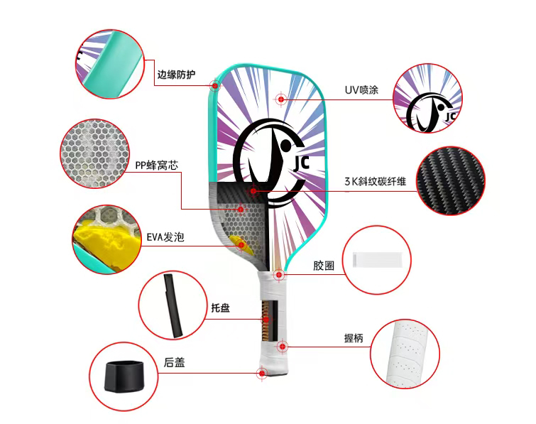 我們分解了匹克球拍。您可以通過下面的解剖圖詳細了解球拍的各個部分,從而完全按照您的需求定制您的匹克球拍: